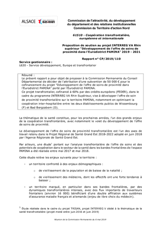 Proposition de soutien au projet INTERREG VA Rhin supérieur "Développement de l'offre de soins de proximité dans l'Eurodistrict PAMINA" 2019 - 2021