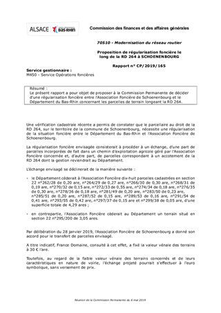 Le présent rapport a pour objet de proposer à la Commission Permanente de décider d'une régularisation foncière entre l'Association Foncière de Schoenenbourg et le Département du Bas-Rhin concernant les parcelles de terrain longeant la RD 264.