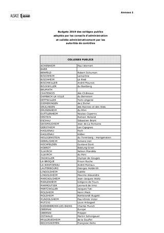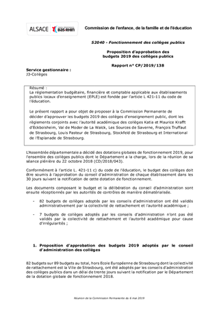 La réglementation budgétaire, financière et comptable applicable aux établissements publics locaux d’enseignement (EPLE) est fondée par l’article L 421-11 du code de l’éducation. Le présent rapport a pour objet de proposer à la Commission Permanente de décider d’approuver les budgets 2019 des collèges d’enseignement public, dont les règlements conjoints avec l’autorité académique des collèges Katia et Maurice Krafft d’Eckbolsheim, Val de Moder de La Walck, Les Sources de Saverne, François Truffaut de Strasbourg, Louis Pasteur de Strasbourg, Stockfeld de Strasbourg et International de l’Esplanade de Strasbourg.