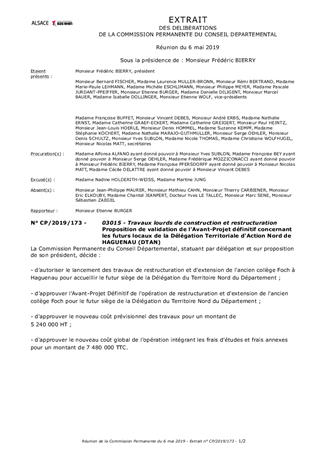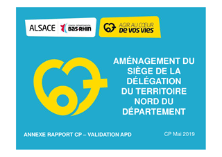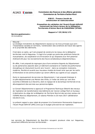 La stratégie immobilière du Département repose sur les trois principes que sont : l’implantation durable en territoire, l’amélioration des conditions de travail des agents et la propriété des bâtiments. C'est dans ce cadre, qu'il est proposé de construire les locaux de la délégation territoriale nord à Haguenau. Il s'agit d'un projet qui porte des ambitions fortes de mutualisation, de coopération et d’innovation et qui disposera d’un fort potentiel d’attractivité pour les recrutements des futurs collaborateurs départementaux. En effet, il est proposé de regrouper plus d’une centaine d’agents du Département ou de partenaires associés dans un bâtiment exemplaire en matière de performance énergétique et résolument tourné vers l’avenir : dans sa conception modulaire, moderne, flexible et ouverts aux nouveaux modes de travail ainsi que par les outils d’information et de communication qui seront offerts aux agents et aux usagers. Outre le regroupement de services du Département, il est proposé d’adosser à ce pôle départemental une Maison des Aînés, à l’instar de celles qui vont être ouvertes à Sélestat ou à Saverne, dans la logique de la dynamique territoriale et du développement des services aux personnes âgées. Le Conseil Départemental a approuvé le Programme Technique Détaillé des travaux de l’opération de transformation des bâtiments de l'ancien collège Foch en bureaux à destination du siège de la délégation du Territoire Nord et des services sociaux de l’UTAMS Nord du Département, en séance Plénière le 20 mars 2017 (délibération CD/2017/113). Le présent rapport a pour objet de proposer à la Commission Permanente d’approuver l’Avant-Projet Définitif (APD) ainsi que le budget prévisionnel de l'opération.
