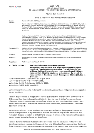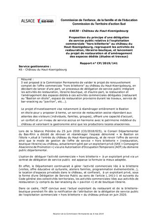 Proposition du principe d'une délégation de service public relative à l'exploitation commerciale "hors billetterie" au château du Haut-Koenigsbourg, regroupant les activités de restauration, librairie-boutique, et lancement du projet de restauration et d'aménagement des espaces dédiés (études et travaux)
