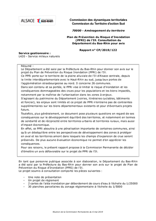 Le Département a été saisi par la Préfecture du Bas-Rhin pour donner son avis sur le projet du Plan de Prévention du Risque Inondation (PPRi) de l’Ill. Ce PPRi porte sur le territoire de la plaine alluviale de l’Ill d’Alsace centrale, depuis la limite interdépartementale avec le Haut-Rhin au sud, jusqu’aux portes de l’agglomération strasbourgeoise au nord. Il concerne 26 communes. Dans son contenu et sa portée, le PPRi vise à limiter le risque d’inondation et les conséquences dommageables des crues pour les populations et les biens impactés, notamment par la maîtrise de l’urbanisation dans les zones à enjeux. S’agissant du patrimoine du Département (voiries, itinéraires cyclables, bâtiments et foncier), les enjeux sont limités et ce projet de PPRi n’entraine pas de contraintes supplémentaires sur les biens départementaux existants et pour d’éventuels projets futurs. Toutefois, plus généralement, ce document pose plusieurs questions en regard de ses conséquences sur le développement équilibré des territoires, et notamment en termes de solidarité et de réciprocité entre territoires urbains et territoires ruraux, mais aussi d’impact économique. En effet, ce PPRi aboutira à une pénalisation importante de certaines communes, ainsi qu’à un déséquilibre entre les perspectives de développement des zones à protéger en aval et les territoires amont dans lesquels les champs d’expansion de crue seront préservés. De plus aucune évaluation économique ne permet d’en apprécier les conséquences. Pour ces raisons, le présent rapport propose à la Commission Permanente de décider d’émettre un avis défavorable sur le projet de PPRi de l’Ill.
