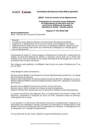 Ce rapport a pour objet de proposer à la Commission Permanente de décider d'approuver le déplacement, du 27 au 29 mai 2019, d'une délégation du Conseil Départemental en Suède afin d'y rencontrer une délégation suédoise, gestionnaire du château de Gunnebo et de confier aux membres de la délégation un mandat spécial pour ce déplacement.