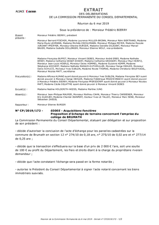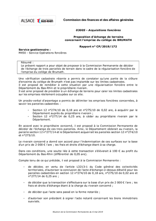 Le présent rapport a pour objet de proposer à la Commission Permanente de décider de l'échange de trois parcelles de terrain dans le cadre de la régularisation foncière de l'emprise du collège de Brumath.
