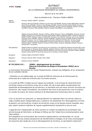 Le Département a été saisi par la Préfecture du Bas-Rhin pour donner son avis sur les quatre projets de Plans de Prévention du Risque d’Inondation (PPRI) de la Bruche dont la consultation s’organise de manière individualisée sur chacun des territoires de : - la Communauté de Communes de la Vallée de la Bruche, - la Communauté de Communes de la Région de Molsheim-Mutzig, - la Commune de Mollkirch, - l’Eurométropole strasbourgeoise pour les Communes d’Achenheim, de Hangenbieten et de Kolbsheim. L'objet du PPRi est de prévenir le risque d’inondation et les conséquences dommageables des crues pour les populations et les biens impactés, notamment par la maîtrise de l’urbanisation dans les zones à enjeux. Concernant le patrimoine du Département les enjeux sont globalement limités et ces PPRi n’entraînent pas de contraintes bloquantes sur les biens départementaux existants et pour d’éventuels projets futurs. Plus largement, ces documents posent plusieurs questions en regard de leurs conséquences sur le développement équilibré des territoires de la vallée, notamment en termes de solidarité et de réciprocité entre territoires urbains et territoires ruraux, ainsi qu’en termes d’impact économique induit. Le présent rapport propose à la Commission Permanente de décider : - d’émettre un avis défavorable sur le projet de PPRi de la Bruche sur le territoire de la Communauté de communes de la vallée de la Bruche en raison principalement de l’absence de la prise en compte des objectifs de revitalisation des centres bourgs de Schirmeck, La Broque et Rothau qui verront leurs possibilité d’évolution considérablement réduites, ainsi que de l’absence d’une évaluation de l’impact économique de ce PPRi sur le territoire ; - d’émettre un avis favorable sur le projet de PPRI de la Bruche sur le territoire de la Communauté de communes de la Région de Molsheim-Mutzig, sous réserve de la mise en cohérence des études d’aléa inondation réalisées par l’Etat et la CDC sur la commune de Molsheim dont les conséquences seront déterminantes pour le développement de l’agglomération, ainsi que d’une appréciation de l’impact économique de ce PPRI ; - d’émettre un avis favorable sur le projet de PPRI de la Bruche sur le territoire de la commune de Mollkirch, sous réserve que soit apprécié l’impact économique de ce PPRI ; - d’émettre un avis favorable sur le projet de PPRi de la Bruche sur le territoire de l’Eurométropole strasbourgeoise pour ce qui concerne les communes de Achenheim, de Hangenbieten et de Kolbsheim, sous réserve que soit apprécié l’impact économique de ce PPRI.