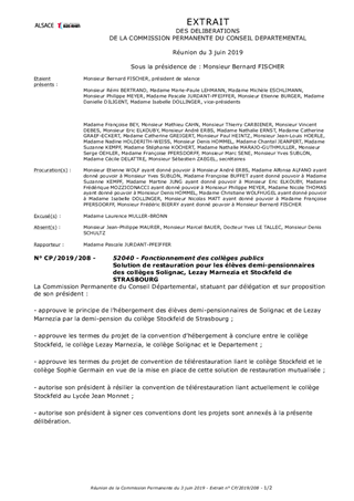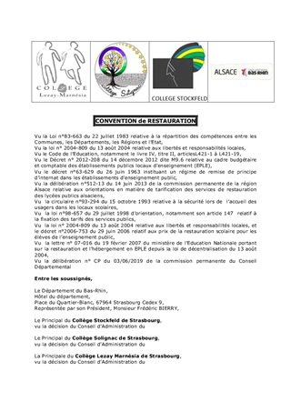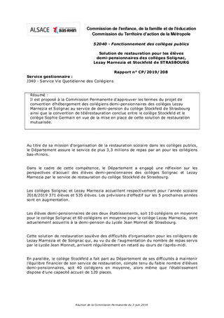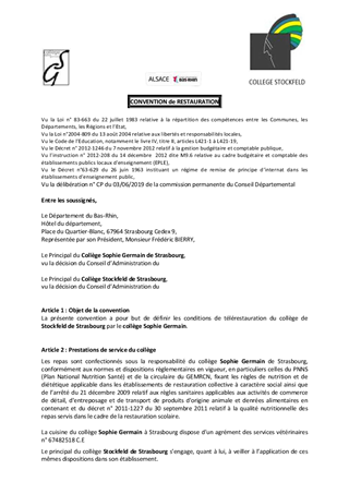 Il est proposé à la Commission Permanente d'approuver les termes du projet de convention d’hébergement des collégiens demi-pensionnaires des collèges Lezay Marnezia et Solignac au service de demi-pension du collège Stockfeld de Strasbourg ainsi que la convention de télérestauration conclue entre le collège Stockfeld et le collège Sophie Germain en vue de la mise en place de cette solution de restauration mutualisée.