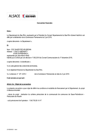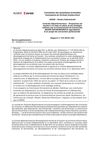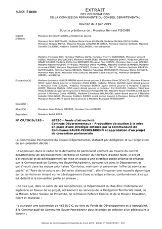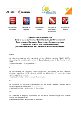 Le Conseil Départemental du Bas-Rhin a décidé, par délibération n° CD/2016/158 du 8 décembre 2016 et CD/2017/004 du 20 mars 2017 de développer un partenariat renforcé avec les acteurs locaux au travers de contrats départementaux de développement territorial et humain. Ces contrats constituent le volet stratégique du partenariat engagé par le Département avec les acteurs locaux sur la période 2018 – 2021. Ils ont vocation à traduire l’ambition collective à l’échelle de chaque territoire d’action du Département et à définir les enjeux prioritaires d’aménagement et de développement co-construits avec les acteurs des territoires. Dans ce cadre, le Conseil Départemental a approuvé le contrat départemental de développement territorial et humain du territoire d’Action Nord, le 11 décembre 2017. Le projet d’attractivité et de développement de mise en place d’une stratégie petite enfance et enfance par la Communauté de Communes Sauer-Pechelbronn, co-construit avec le Département, s’inscrit dans les enjeux prioritaires "Conforter, maintenir et pérenniser l’offre de service au public" et "Faire de la culture un réel levier d’attractivité". Il a pour ambition d’impulser une nouvelle dynamique sur ce territoire en misant sur le développement d’une stratégie enfance. Il est proposé à la Commission Permanente de décider d'attribuer une contribution financière du Département, au titre du Fonds de Développement et d’Attractivité, pour la création de périscolaires, et d’approuver les termes du projet de convention de partenariat à conclure avec la Communauté de Communes Sauer-Pechelbronn, les Communes de Lembach, Woerth, Merkwiller-Pechelbronn, Hegeney et Durrenbach ainsi que la FDMJC.