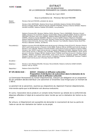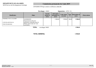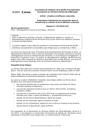 Dans le cadre de sa politique culturelle, le Département apporte un soutien au développement artistique de ses territoires ainsi qu'aux actions de médiation culturelle en faveur des Bas-Rhinois. Le présent rapport a pour objet de proposer à la Commission Permanente de décider d'attribuer une subvention à l'ensemble vocal Allegro pour un montant de 1 500 €.