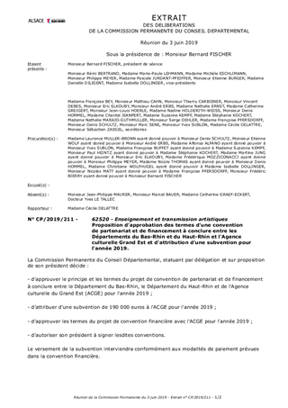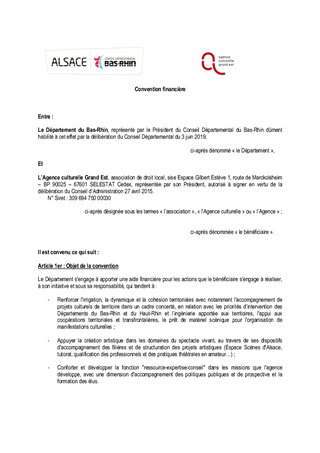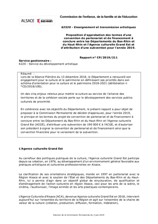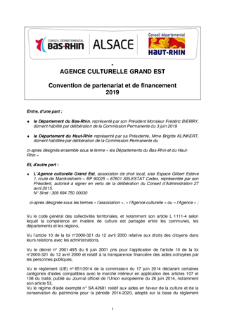 Proposition d'approbation des termes d'une convention de partenariat et de financement à conclure entre les Départements du Bas-Rhin et du Haut-Rhin et l'Agence culturelle Grand Est et d'attribution d'une subvention pour l'année 2019.