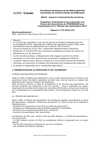 La "rentrée des associations" aura lieu au parc de la Citadelle à Strasbourg les 28 et 29 septembre 2019. Organisée par la Maison des Associations depuis 1994, cette manifestation phare du département réunit près de 300 structures. Lors de sa séance du 19 juin 2017, l'Assemblée Départementale a décidé par délibération n° CD/2017/027 des orientations stratégiques en faveur du soutien du Département à la vie associative. Au titre de cette politique, le Département s’est engagé à soutenir les actions constituant un levier pour ses territoires et favorisant l’engagement bénévole. Le présent rapport a pour objet de proposer à la Commission Permanente de décider d'attribuer une subvention à la Maison des Associations de Strasbourg afin d’apporter un soutien à l’organisation de la "rentrée des associations".