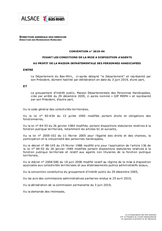 Le groupement d’intérêt public (GIP) « Maison Départementale des Personnes Handicapées » (MDPH) bénéficie depuis sa création en 2005 de la mise à disposition d’agents du Département du Bas-Rhin. Le présent rapport a pour objet de proposer à la Commission Permanente de décider de la mise à jour de la convention du 18 mai 2018 portant mise à disposition de 60 agents du Département auprès du GIP MDPH, ainsi que de décider de la mise à disposition auprès du GIP MDPH, pour une période de trois ans, à compter du 1er juillet 2019, de sept fonctionnaires du Département.