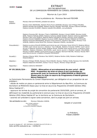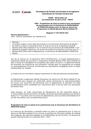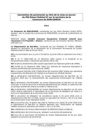 Le présent rapport a pour objet de proposer à la Commission Permanente de décider de mettre en place un partenariat pour la mise en œuvre du Programme d'Intérêt Général (PIG) Rénov'Habitat 67 sur le territoire de la Commune de DORLISHEIM. Il est également proposé d'approuver les termes du projet de convention à conclure pour la période 2019-2020 entre le Département, la Commune de DORLISHEIM et PROCIVIS Alsace.