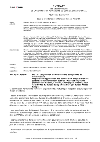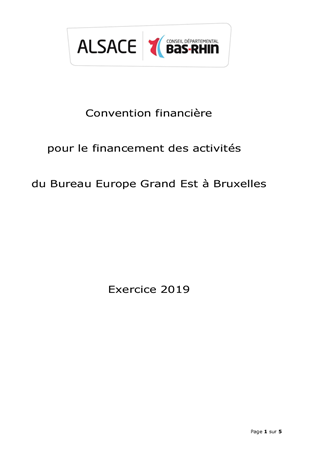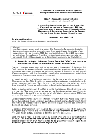 Le présent rapport a pour objet de proposer à la Commission Permanente de décider d'approuver les termes d'un projet d'avenant financier définissant l'attribution d'une subvention au titre de l'exercice 2019 d'un montant (inchangé) de 65 200 euros pour les activités du Bureau Europe Grand Est, conformément à la convention-cadre de partenariat 2018-2020 approuvée par la Commission Permanente du 9 juillet 2018.