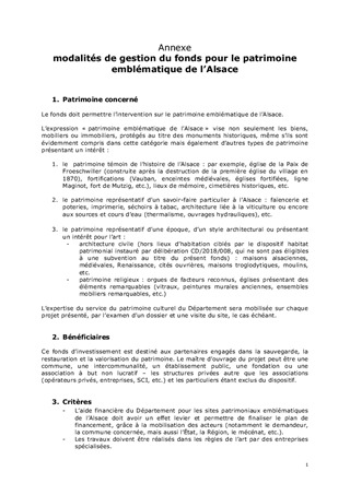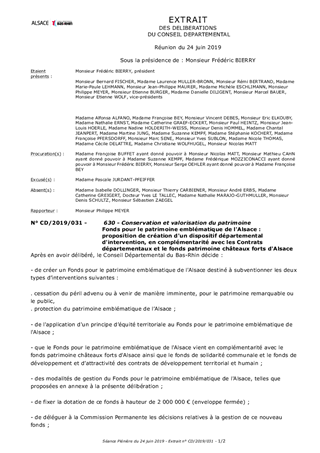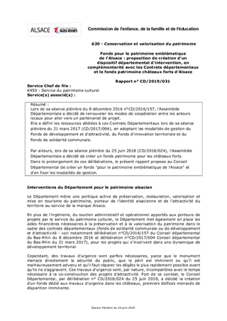 Lors de sa séance plénière du 8 décembre 2016 n°CD/2016/157, l’Assemblée Départementale a décidé de renouveler les modes de coopération entre les acteurs locaux pour aller vers un partenariat de projet. Elle a défini les ressources dédiées à ces Contrats Départementaux lors de sa séance plénière du 21 mars 2017 (CD/2017/004), en adoptant les modalités de gestion du Fonds de développement et d’attractivité, du Fonds d’innovation territoriale et du Fonds de solidarité communale. Par ailleurs, lors de sa séance plénière du 25 juin 2018 (CD/2018/024), l'Assemblée Départementale a décidé de créer un fonds patrimoine pour les châteaux forts. Dans le prolongement de ces délibérations, le présent rapport propose au Conseil Départemental de créer un fonds "pour le patrimoine emblématique de l'Alsace" et d'en fixer les modalités de gestion.