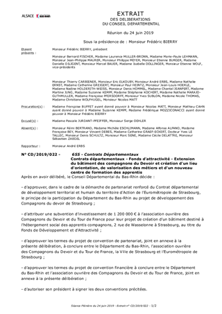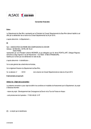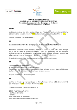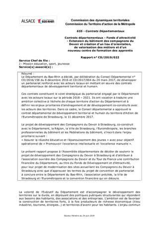 Le Département du Bas-Rhin a décidé, par délibération du Conseil Départemental n° CD/2016/158 du 8 décembre 2016 et CD/2017/004 du 20 mars 2017, de développer un partenariat renforcé avec les acteurs locaux en mettant en œuvre des contrats départementaux de développement territorial et humain. Ces contrats constituent le volet stratégique du partenariat engagé par le Département avec les acteurs locaux sur la période 2018 – 2021. Ils ont vocation à traduire une ambition collective à l’échelle de chaque territoire d’action du Département et à définir les enjeux prioritaires d’aménagement et de développement co-construits avec les acteurs des territoires. Dans ce cadre, le Conseil départemental a approuvé le contrat départemental de développement territorial et humain du territoire d’Action de l'Eurométropole de Strasbourg, le 11 décembre 2017. Le projet de développement des Compagnons du Devoir à Strasbourg, co-construit avec le Département, la Région, la Ville de Strasbourg, l’Eurométropole, les branches professionnelles du bâtiment et les Fédérations du bâtiment, s’inscrit dans l’enjeu prioritaire suivant : « Assurer la réussite éducative et l’épanouissement des jeunes » avec pour objectif opérationnel de « Promouvoir l’excellence intellectuelle et l’excellence manuelle ». Le présent rapport propose à l’Assemblée départementale de décider de soutenir le projet de développement des Compagnons du Devoir à Strasbourg et d'attribuer à l’association ouvrière des Compagnons du Devoir et du Tour de France une contribution financière du Département, au titre du Fonds de Développement et d'Attractivité, pour leur projet de modernisation des sites accueillant les Compagnons du Devoir à Strasbourg ainsi que d’approuver les termes du projet de convention de partenariat à conclure entre le Département du Bas-Rhin, l’association précitée, la Ville de Strasbourg et l’Eurométropole et la convention financière qui en découle.