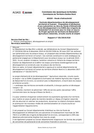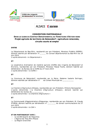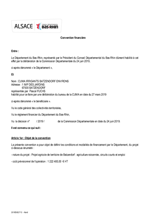 Le Département du Bas-Rhin a décidé, par délibérations du Conseil Départemental n° CD/2016/158 du 8 décembre 2016 et CD/2017/004 du 20 mars 2017 de renforcer son partenariat avec les acteurs locaux, en proposant des contrats départementaux de développement territorial et humain. Ces contrats constituent le volet stratégique du partenariat engagé par le Département avec les acteurs locaux sur la période 2018 – 2021. Ils ont vocation à traduire l’ambition collective à l’échelle de chaque territoire d’action du Département et à définir les enjeux prioritaires d’aménagement et de développement co-construits avec les acteurs des territoires. Dans ce cadre, le Conseil départemental a approuvé le contrat départemental de développement territorial et humain du territoire d’Action Nord le 11 décembre 2017 (délibération n° CD/2017/077). Le projet d’attractivité et de développement " Agriculture raisonnée, circuits courts et emploi » de la CUMA (Coopérative d’utilisation de matériel Agricole) des irrigants de Batzendorf et environs, co-construit avec le Département, s’inscrit dans les enjeux prioritaires suivants : - « aménager des territoires connectés et attractifs, à énergie positive et développer l'emploi » et - « conforter, maintenir et pérenniser l'offre de service public (dynamiser l'offre commerciale dans les bourgs d'Alsace du Nord) ». Il a pour ambition d’organiser collectivement les exploitants agricoles d’un territoire pour mettre en place et gérer de manière durable un réseau d’irrigation raisonnée afin de sécuriser et valoriser les productions, dynamiser la création d’emplois stables et promouvoir les nouveaux modes de commercialisation en circuits courts sur l’agglomération haguenovienne. Il est proposé au Conseil départemental d'attribuer au titre du Fonds de Développement et d'Attractivité une subvention d’investissement maximale de 366 746 € à la CUMA des irrigants de Batzendorf et environs, correspondant à 30% des dépenses prévisionnelles éligibles hors taxe du projet. Il est également proposé au Conseil départemental d'approuver les termes des projets de convention de partenariat et de convention financière à conclure.