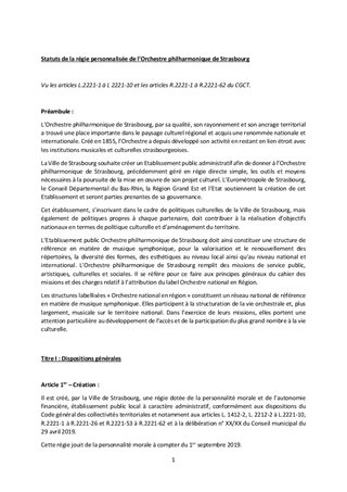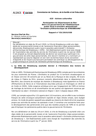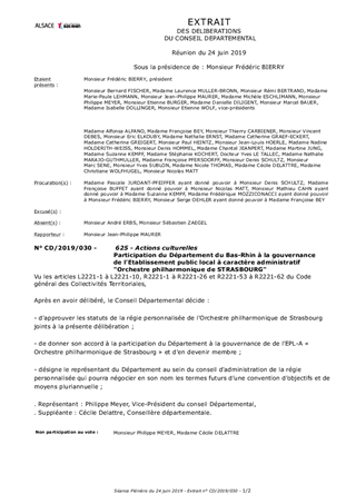 Par délibération en date du 29 avril 2019, la Ville de Strasbourg a créé une régie dotée de la personnalité morale et de l’autonomie financière (régie personnalisée), dénommée, Etablissement public local à caractère administratif « Orchestre philharmonique de Strasbourg » (OPS) . Cet établissement public local sera chargé de l’exploitation des activités du service de l’Orchestre à partir du 1er janvier 2020. Il est proposé au Conseil départemental de donner son accord pour participer à la gouvernance de cette régie personnalisée, d’en devenir membre en y nommant un représentant qui pourra négocier en son nom les termes futurs d’une convention d’objectifs et de moyens pluriannuelle permettant de contribuer au développement du projet artistique et culturel de l'Orchestre philharmonique de Strasbourg.