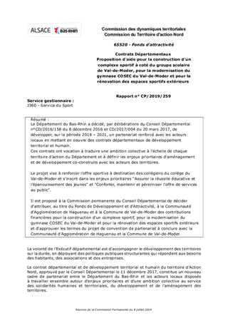 Contrats Départementaux Proposition d'aide pour la construction d'un complexe sportif à coté du groupe scolaire de Val-de-Moder, pour la modernisation du gymnase COSEC du Val-de-Moder et pour la rénovation des espaces sportifs extérieurs