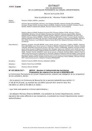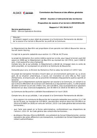 Le présent rapport a pour objet de proposer à la Commission Permanente de décider de la cession d’un terrain à Bouxwiller au profit de la Commune.