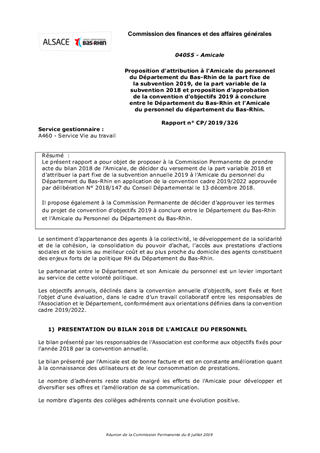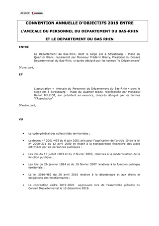 Le présent rapport a pour objet de proposer à la Commission Permanente de prendre acte du bilan 2018 de l’Amicale, de décider du versement de la part variable 2018 et d’attribuer la part fixe de la subvention annuelle 2019 à l’Amicale du personnel du Département du Bas-Rhin en application de la convention cadre 2019/2022 approuvée par délibération N° 2018/147 du Conseil Départemental le 13 décembre 2018. Il propose également à la Commission Permanente de décider d’approuver les termes du projet de convention d’objectifs 2019 à conclure entre le Département du Bas-Rhin et l’Amicale du Personnel du Département du Bas-Rhin.