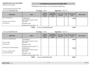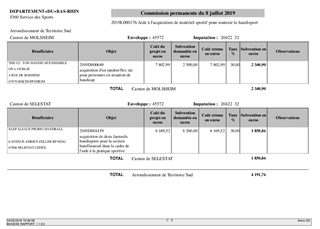Le présent rapport propose à la Commission Permanente d'attribuer des aides relevant de la politique sportive adoptée en Assemblée Plénière du 22 octobre 2018 (délibération N°CD/2018/044). Il s'agit d'une part, de dispositifs d'aide révisés ou confirmés : aide à la licence sportive et à la valorisation du bénévolat, aide aux manifestations sportives, aide aux déplacements dans le cadre de compétitions sportives scolaires. Il s'agit d'autre part de nouveaux dispositifs : aide à l’acquisition du matériel sportif aux associations accueillant des personnes en situation de handicap, aide aux clubs sportifs proposant un projet d’intérêt territorial.