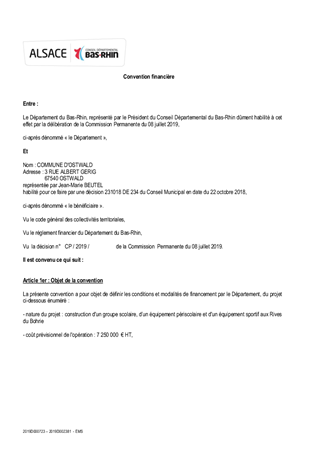 Le Département du Bas-Rhin a décidé, par délibérations du Conseil Départemental n°CD/2016/157 du 8 décembre 2016 et n°CD/2017/004 du 20 mars 2017, de développer un partenariat renforcé avec les acteurs locaux en mettant en oeuvre des contrats départementaux de développement territorial et humain. Ces contrats constituent le volet stratégique du partenariat engagé par le Département avec les acteurs locaux sur la période 2018-2021. Ils ont pour vocation à traduire une ambition collective à l'échelle de chaque territoire d'action du Département et à définir les enjeux prioritaires d'aménagement et de développement co-construits avec les acteurs du territoire. Dans ce cadre, le Conseil Départemental a approuvé les termes du contrat départemental de développement territorial et humain du territoire d'Action Eurométropole, le 11 décembre 2017. Le projet de création d'un équipement périscolaire à Ostwald co-construit avec le Département, s'inscrit dans les enjeux prioritaires "d'accompagner le maintien d'une offre de service de proximité" et "assurer la réussite éducative et l'épanouissement des jeunes". Il est proposé à la Commission Permanente de décider d'attribuer une subvention à la Commune d'Ostwald pour son projet de création d'un équipement périscolaire, d'approuver les termes du projet de convention de partenariat à conclure entre la Commune d'Ostwald, le Collège Martin SCHONGAUER et le Département du Bas-Rhin, d'approuver les termes du projet de convention financière à conclure entre la Commune d'Ostwald et le Département du Bas-Rhin pour permettre le versement de la subvention correspondante, et d'autoriser son Président à signer ces conventions.