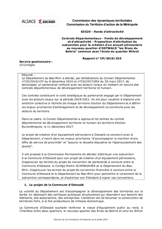 Contrats Départementaux - Fonds de développement et d'attractivité - Proposition d'attribution de subvention pour la création d'un accueil périscolaire au nouveau quartier d'OSTWALD "les Rives du Bohrie" commun avec l'école du quartier Wihrel