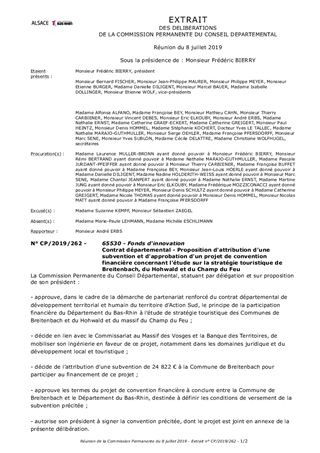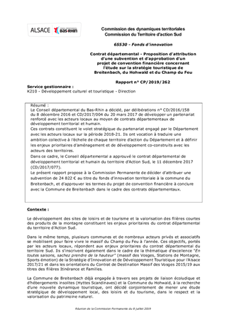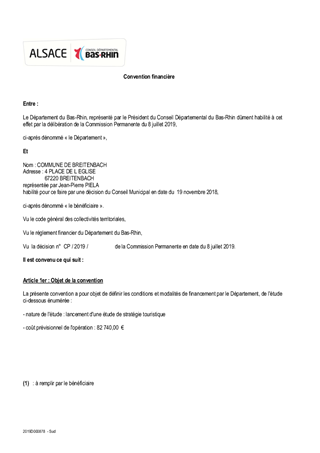 Contrat départemental - Proposition d'attribution d'une subvention et d'approbation d'un projet de convention financière concernant l'étude sur la stratégie touristique de Breitenbach, du Hohwald et du Champ du Feu