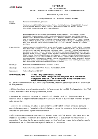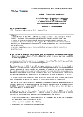 Le Département du Bas-Rhin a affirmé sa politique jeunesse à travers le plan d'Action Enfance, Jeunesse, Famille adopté par l'Assemblée Plénière en juin 2018. Dans ce cadre, le Département contribue à l’autonomie des jeunes en soutenant les associations départementales qui développent des actions socio-éducatives visant à accompagner les jeunes dans leur parcours de vie et favorisant leur responsabilité et leur engagement. Le présent rapport propose de décider d'attribuer une subvention à l'association Unis'Cité Alsace.