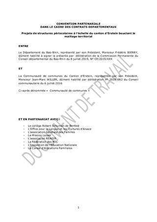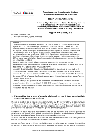 Le Département du Bas-Rhin a décidé, par délibération du Conseil Départemental n° CD/2016/157 du 8 décembre 2016 et n° CD/2017/004 du 20 mars 2017, de développer un partenariat renforcé avec les acteurs locaux en mettant en œuvre les contrats départementaux de développement territorial et humain. Ces contrats constituent le volet stratégique de partenariat engagé par le Département avec les acteurs locaux sur la période 2018-2021. Ils ont pour vocation de traduire une ambition collective à l'échelle de chaque territoire d'action du Département et de définir les enjeux prioritaires d'aménagement et de développement co-construits avec les acteurs du territoire. Dans ce cadre, le Conseil Départemental a approuvé les termes du contrat départemental de développement territorial et humain du territoire d'action Sud, le 11 décembre 2017 (délibération n°CD/2017/077). Le projet de construction d'équipements périscolaires au sein de la zone sud de la Communauté de communes du Canton d'Erstein, co-construit avec le Département, s'inscrit dans les enjeux prioritaires "d'accompagner le maintien d'une offre de service de proximité" et "d'assurer la réussite éducative et l'épanouissement des jeunes" de ce contrat départemental. Dans ce cadre, il est proposé à la Commission Permanente de décider d'attribuer une subvention d'un montant total de 688 680 euros et d'approuver les termes du projet de convention partenariale et de convention financière à conclure en vue de la réalisation de ces travaux.