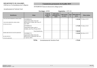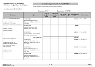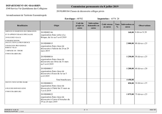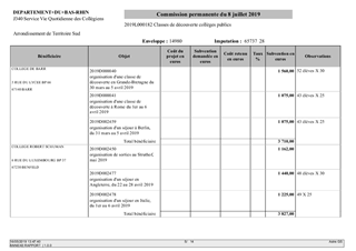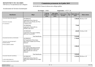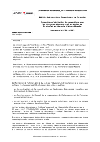 Le présent rapport s’inscrit dans le Plan "Actions éducatives et Collèges" approuvé par le Conseil Départemental le 20 mars 2017. L’action 19 "Classes de découverte – collèges", intégré à l’axe 1 "Devenir un citoyen responsable et autonome", se propose d’élargir l’horizon des collégiens en favorisant la découverte et l’apprentissage en dehors du collège. A ce titre, le Département attribue des subventions pour des voyages scolaires organisés par les collèges publics et privés. Par ailleurs, le Département subventionne intégralement les frais de transport et d’entrée pour les classes de 3ème au Struthof et du mémorial d’Alsace Moselle. Il est proposé à la Commission Permanente de décider d’attribuer des subventions aux collèges publics et privés dans le cadre de voyages scolaires organisés dans le courant de l’année scolaire 2018/2019. Elles concernent 47 établissements, soit 4 043 élèves.