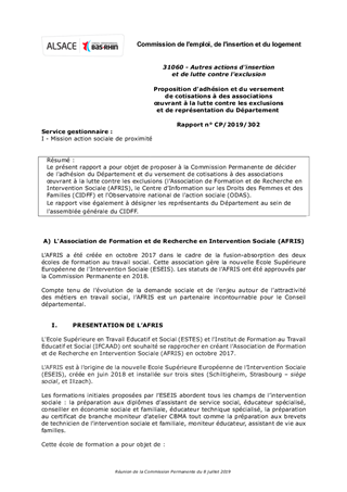 Le présent rapport a pour objet de proposer à la Commission Permanente de décider de l'adhésion du Département et du versement de cotisations à des associations œuvrant à la lutte contre les exclusions (l’Association de Formation et de Recherche en Intervention Sociale (AFRIS), le Centre d’Information sur les Droits des Femmes et des Familles (CIDFF) et l'Observatoire national de l'action sociale (ODAS). Le rapport vise également à désigner les représentants du Département au sein de l'assemblée générale du CIDFF.