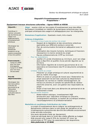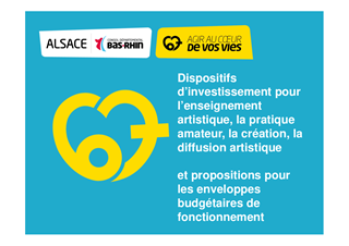 Le Département du Bas-Rhin a décidé, par délibération du Conseil Départemental du 13 décembre 2018, d’adopter le schéma d’orientation pour la culture et le patrimoine pour la période 2018-2021, Ce schéma fixe l’objectif de garantir des services culturels de proximité dans le domaine de la création artistique, de la diffusion artistique, de la pratique artistique en amateur, de l'enseignement artistique et de l'éducation artistique et culturelle. Dans ce cadre le schéma prévoit un nouveau mode d’intervention du Département du Bas-Rhin et notamment une proposition de nouveaux modes d’intervention en investissement. Le présent rapport a pour objet de proposer à la Commission Permanente de décider d’adopter un dispositif d’aide ciblé sur les projets d’investissement avec des effets facilitateurs immédiats en matière de dynamiques collectives pour les pratiques artistiques des usagers et pédagogiques pour les enseignants.