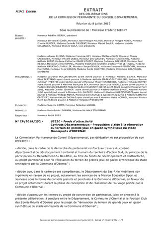 Le Conseil départemental du Bas-Rhin a décidé, par délibérations n° CD/2016/158 du 8 décembre 2016 et CD/2017/004 du 20 mars 2017 de développer un partenariat renforcé avec les acteurs locaux au travers de contrats départementaux de développement territorial et humain. Ces contrats constituent le volet stratégique du partenariat engagé par le Département avec les acteurs locaux sur la période 2018 – 2021. Ils ont vocation à traduire une ambition collective à l’échelle de chaque territoire d’action du Département et à définir les enjeux prioritaires d’aménagement et de développement co-construits avec les acteurs des territoires. Dans ce cadre, le Conseil Départemental a approuvé le contrat départemental de développement territorial et humain du territoire d’Action Sud, le 11 décembre 2017. Le présent rapport propose à la Commission Permanente de décider d’attribuer une contribution financière du Département d’un montant de 150 000 € au titre du Fonds de Développement et d’Attractivité et d’approuver les termes du projet de convention de partenariat annexé, ainsi que la convention financière qui en découle pour la rénovation du terrain de football en gazon synthétique par la Commune d'Obernai. Dans ce cadre, il est également proposé à la Commission Permanente de décider d’approuver les termes des deux projets de convention d’utilisation des équipements sportifs à conclure entre le Département, la Commune d'Obernai et respectivement, les collèges Freppel et Europe d'Obernai.
