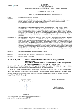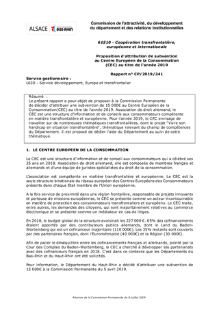 Le présent rapport a pour objet de proposer à la Commission Permanente de décider d'attribuer une subvention de 15 000€ au Centre Européen de la Consommation(CEC) au titre de l'année 2019. Association de droit allemand, le CEC est une structure d’information et de conseils aux consommateurs compétente en matière transfrontalière et européenne. Pour l'année 2019, le CEC envisage de travailler sur de nombreuses thématiques transfrontalières, dont le projet "Vivre son handicap en situation transfrontalière", thématique relevant du champ de compétences du Département. Il est proposé de dédier l'aide du Département au suivi de cette thématique.