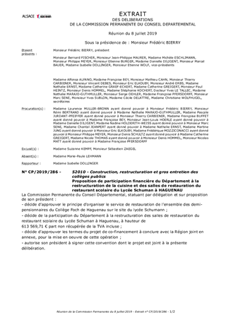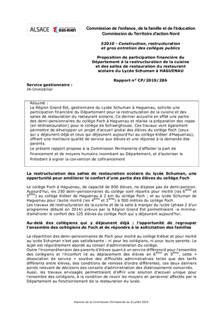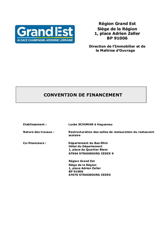 La Région Grand Est, gestionnaire du Lycée Schuman à Haguenau, sollicite une participation financière du Département pour la restructuration de la cuisine et des salles de restauration du restaurant scolaire. Ce dernier accueille en effet une partie des demi-pensionnaires du collège Foch à Haguenau et réalise la préparation des repas (en télérestauration) pour le collège de Schweighouse. Ces travaux vont également permettre de développer un projet d’accueil global des élèves du collège Foch (ceux qui y déjeunent déjà et ceux qui déjeunent aujourd’hui au collège Kléber d’Haguenau), offrant une meilleure qualité de service aux élèves et une réponse à la demande des parents. Le présent rapport propose à la Commission Permanente d'affecter la part de financement et de moyens humains incombant au Département, et d’autoriser le Président à signer la convention de cofinancement