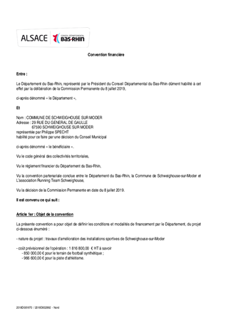 Le Conseil départemental du Bas-Rhin a décidé, par délibérations n° CD/2016/158 du 8 décembre 2016 et CD/2017/004 du 20 mars 2017 de développer un partenariat renforcé avec les acteurs locaux au travers de contrats départementaux de développement territorial et humain. Ces contrats constituent le volet stratégique du partenariat engagé par le Département avec les acteurs locaux sur la période 2018 – 2021. Ils ont vocation à traduire une ambition collective à l’échelle de chaque territoire d’action du Département et à définir les enjeux prioritaires d’aménagement et de développement co-construits avec les acteurs des territoires. Dans ce cadre, le Conseil Départemental a approuvé le contrat départemental de développement territorial et humain du territoire d’Action Nord, le 11 décembre 2017. Le présent rapport propose à la Commission Permanente de décider d’attribuer une subvention d’un montant de 545 040 € à la Commune de Schweighouse-sur-Moder au titre du Fonds de Développement et d'Attractivité et d’approuver les termes des projets de convention de partenariat et d'utilisation des équipements sportifs annexés, ainsi que la convention financière qui en découle, pour la construction d'un terrain de grands jeux en gazon synthétique et d'une piste d'athlétisme par la Commune de Schweighouse-sur-Moder.