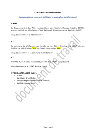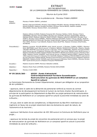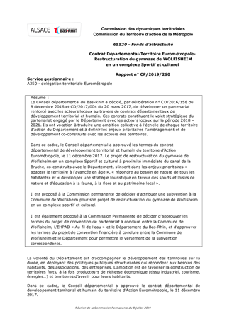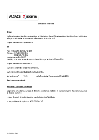 Le Conseil départemental du Bas-Rhin a décidé, par délibération n° CD/2016/158 du 8 décembre 2016 et CD/2017/004 du 20 mars 2017, de développer un partenariat renforcé avec les acteurs locaux au travers de contrats départementaux de développement territorial et humain. Ces contrats constituent le volet stratégique du partenariat engagé par le Département avec les acteurs locaux sur la période 2018 – 2021. Ils ont vocation à traduire une ambition collective à l’échelle de chaque territoire d’action du Département et à définir les enjeux prioritaires l’aménagement et de développement co-construits avec les acteurs des territoires. Dans ce cadre, le Conseil départemental a approuvé les termes du contrat départemental de développement territorial et humain du territoire d’Action Eurométropole, le 11 décembre 2017. Le projet de restructuration du gymnase de Wolfisheim en un complexe Sportif et culturel à proximité immédiate du canal de la Bruche, co-construits avec le Département, s’inscrit dans les enjeux prioritaires « adapter le territoire à l’avancée en âge », « répondre au besoin de nature de tous les habitants» et « développer une stratégie touristique en faveur des sports et loisirs de nature et d’éducation à la faune, à la flore et au patrimoine local ». Il est proposé à la Commission permanente de décider d’attribuer une subvention à la Commune de Wolfisheim pour son projet de restructuration du gymnase de Wolfisheim en un complexe sportif et culturel. Il est également proposé à la Commission Permanente de décider d’approuver les termes du projet de convention de partenariat à conclure entre la Commune de Wolfisheim, L’EHPAD « Au fil de l’eau » et le Département du Bas-Rhin, et d’approuver les termes du projet de convention financière à conclure entre la Commune de Wolfisheim et le Département pour permettre le versement de la subvention correspondante.