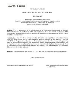 Le présent rapport propose à la Commission Permanente de décider : - d’accorder la modification des conditions de la contre-garantie à l’association Les Maisons de la Croix ; - d’accorder la garantie du Département à l’Association Illkirchoise des Parents et amis de Handicapés Mentaux pour financer la rénovation et l’extension des hébergements du Foyer d’Accueil Spécialisé à Illkirch Graffenstaden ; - d’approuver les termes des projets de convention et d’avenant à la convention à conclure pour la mise en œuvre de cette décision.