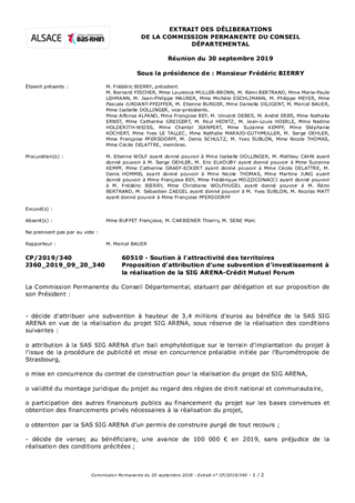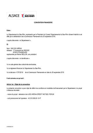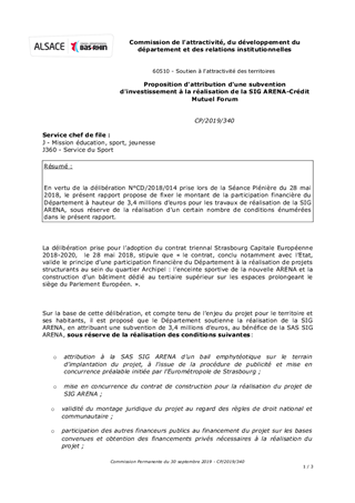 En vertu de la délibération N°CD/2018/014 prise lors de la Séance Plénière du 28 mai 2018, le présent rapport propose de fixer le montant de la participation financière du Département à hauteur de 3,4 millions d’euros pour les travaux de réalisation de la SIG ARENA, sous réserve de la réalisation d’un certain nombre de conditions énumérées dans le présent rapport.