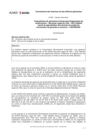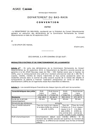 Le présent rapport propose à la Commission Permanente d’accorder une garantie d’emprunt pour un prêt souscrit par la SA d’HLM Nouveau Logis de l’Est – CDC Habitat social pour l’opération d’acquisition de logements situés à Châtenois et d’approuver les termes du projet de convention à conclure pour la mise en œuvre de cette décision.