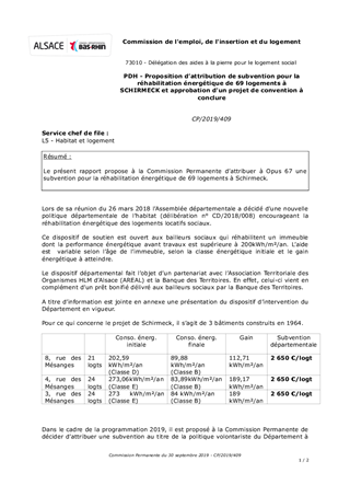 PDH - Proposition d’attribution de subvention pour la réhabilitation énergétique de 69 logements à SCHIRMECK et approbation d'un projet de convention à conclure
