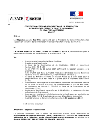 Le présent rapport propose à la Commission Permanente d’attribuer des agréments à PIERRES ET TERRITOIRES DE FRANCE-ALSACE pour des prêts sociaux de location-accession (PSLA) concernant la construction de 9 logements collectifs situés 7b, rue des Pâquerettes à Oberhoffen-sur-Moder et la construction de 8 logements collectifs situés route de Weitbruch à Haguenau. Il propose également d’attribuer une subvention départementale suite à la demande de particuliers au titre de l’accession sociale à la propriété dans le cadre du dispositif de prêt social de location accession (PSLA) pour une opération réalisée par AMELOGIS à Griesheim-Près-Molsheim.