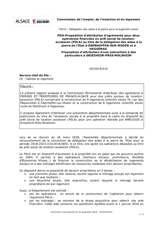 PDH-Proposition d’attribution d’agréments pour deux opérations financées en prêt social de location-accession (PSLA) au titre de la délégation des aides à la pierre de l’Etat à OBERHOFFEN-SUR-MODER et à HAGUENAU Proposition d’attribution d’une subvention à des particuliers à GRIESHEIM-PRES-MOLSHEIM
