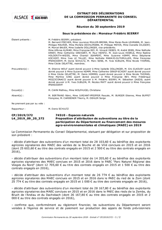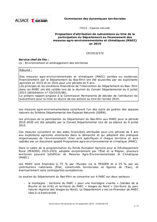 Des mesures agro-environnementales et climatiques (MAEC) portées ou soutenues financièrement par le Département du Bas-Rhin ont été souscrites par les exploitants agricoles en 2015 et en 2016 pour une période de 5 ans. Les principes et les conditions financières de l’intervention du Département du Bas- Rhin dans les MAEC ont été validés lors de la réunion du Conseil Départemental du 6 juillet 2015 (délibération n° CD/2015/86). Le présent rapport propose à la Commission Permanente de décider de l'attribution de subventions pour la mise en œuvre de ces actions au titre de l’année 2019.