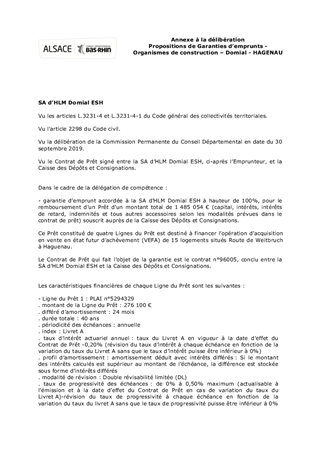 Le présent rapport propose à la Commission Permanente d’accorder une garantie d’emprunt pour un prêt souscrit par la SA d’HLM Domial ESH pour une opération d’acquisition de logements situés à Haguenau.