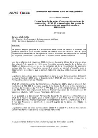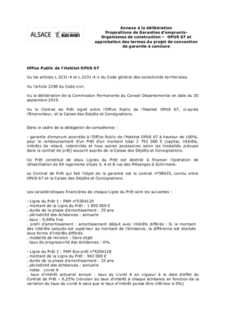 Le présent rapport propose à la Commission Permanente de décider d’accorder une garantie d’emprunt pour un prêt souscrit par l’Office Public de l’Habitat OPUS 67 pour l’opération de réhabilitation de logements situés à Schirmeck et d’approuver les termes du projet de convention à conclure pour la mise en œuvre de cette décision.