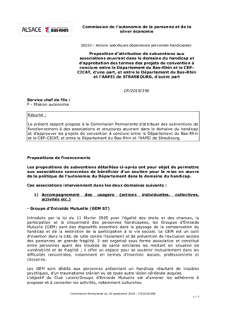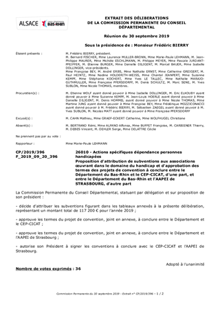 Proposition d'attribution de subventions aux associations œuvrant dans le domaine du handicap et d'approbation des termes des projets de convention à conclure entre le Département du Bas-Rhin et le CEP-CICAT, d’une part, et entre le Département du Bas-Rhin et l’AAPEI de STRASBOURG, d’autre part