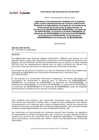 Opérations d’investissement réalisées sur le domaine public routier départemental par d’autres collectivités - Proposition d’approbation de projets de conventions de financement de la TVA entre le Département, la Commune de WANGENBOURG-ENGENTHAL, la Commune de HURTIGHEIM, la Commune de VOELLERDINGEN, la Commune de WEISLINGEN, la Commune de REXINGEN, la Commune de SCHLEITHAL, la Commune de WISSEMBOURG et la Commune de BASSEMBERG