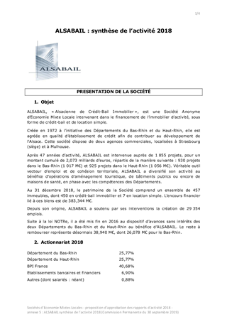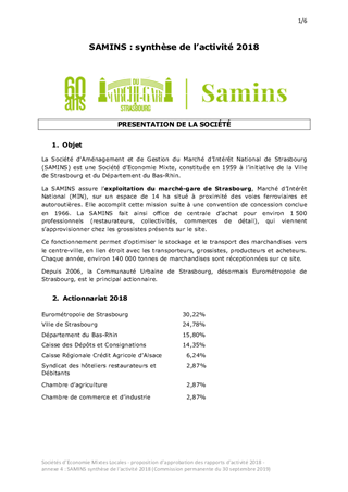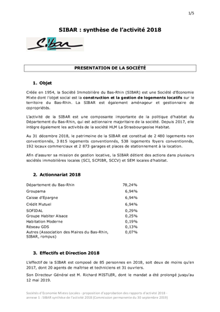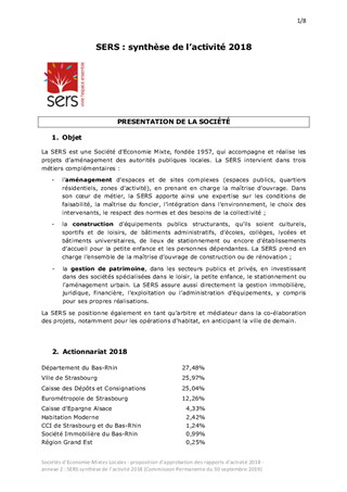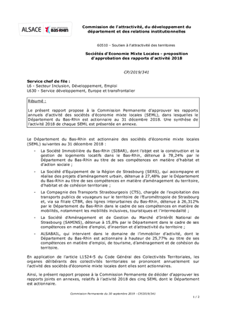 Le présent rapport propose à la Commission Permanente d'approuver les rapports annuels d'activité des sociétés d'économie mixte locales (SEML), dans lesquelles le Département du Bas-Rhin est actionnaire au 31 décembre 2018. Une synthèse de l'activité 2018 de chaque SEML est présentée en annexe.